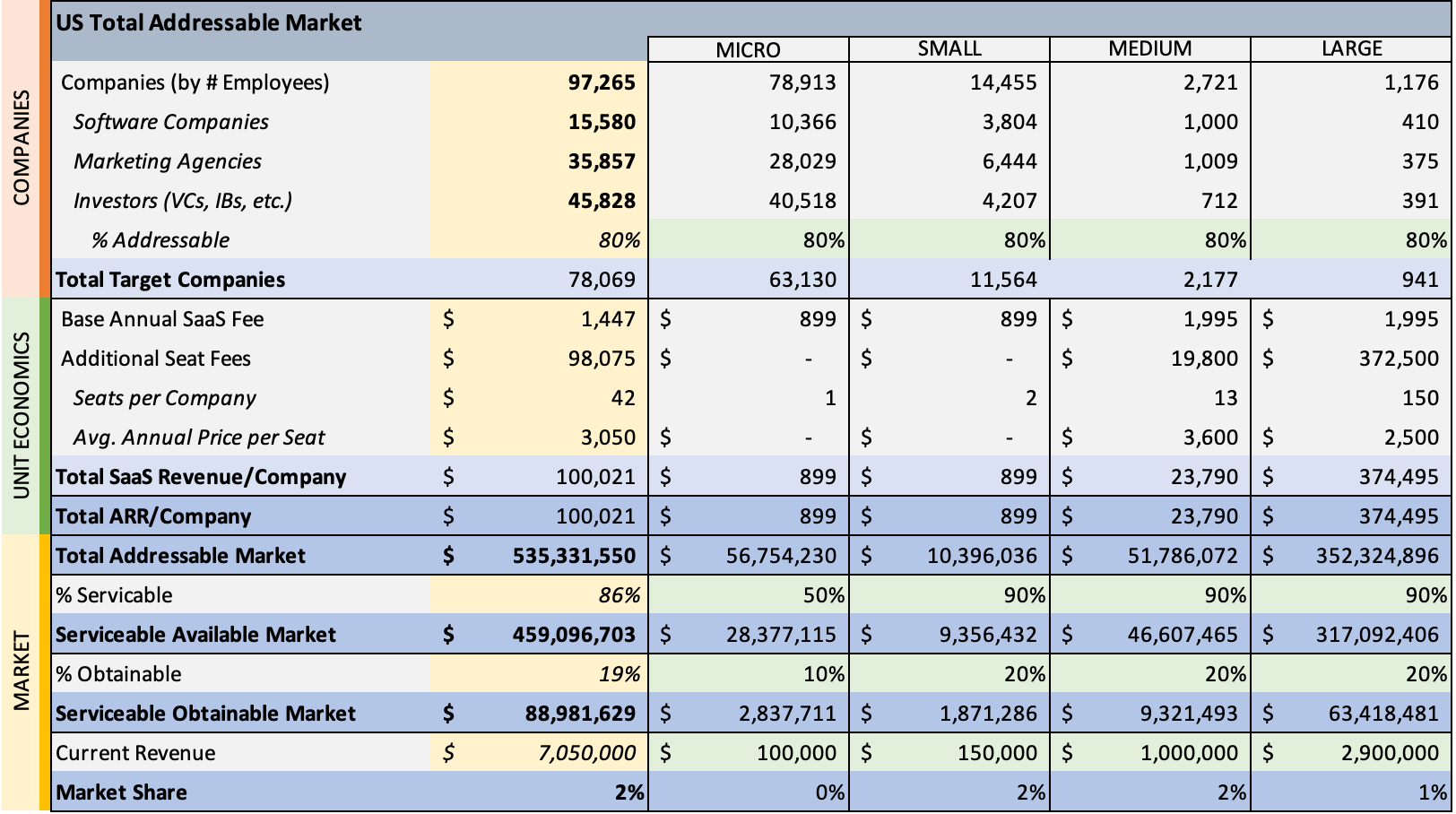 The TAM template, included at the link below, will give you a way to size a B2B (business-to-business) market segmented by business size, but you can also modify it to segment by geography, market vertical, or another method relevant to your business.