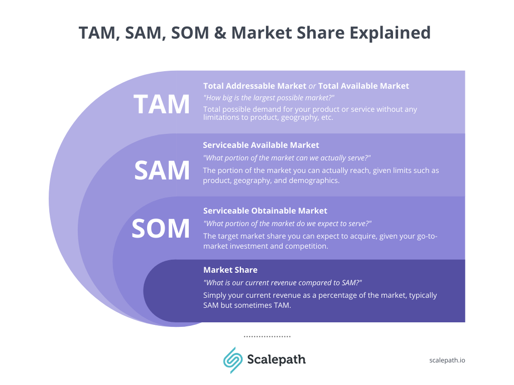 TAM, SAM, SOM, and market share are ways to break down and understand a company’s revenue opportunity for a specific product or service.